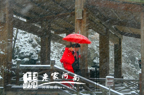 冬日的西九華山,銀裝素裹白雪飄飄,一對(duì)剛辦完婚禮的夫婦,給漫雪紛飛的西九華山帶來了完全不一樣的景致,原來冬的色彩,不只有銀色,皚皚白雪中或許有你有我的身姿在這里流連忘返,簡(jiǎn)單的牽手雪中漫步,亦是一種浪漫,一不小心白了頭,是一種幸福!