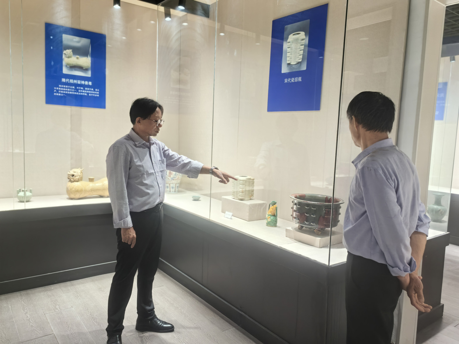 尚瓷文化藝術(shù)館館長(zhǎng)溫杰(左)為游客介紹展品 薛力 攝