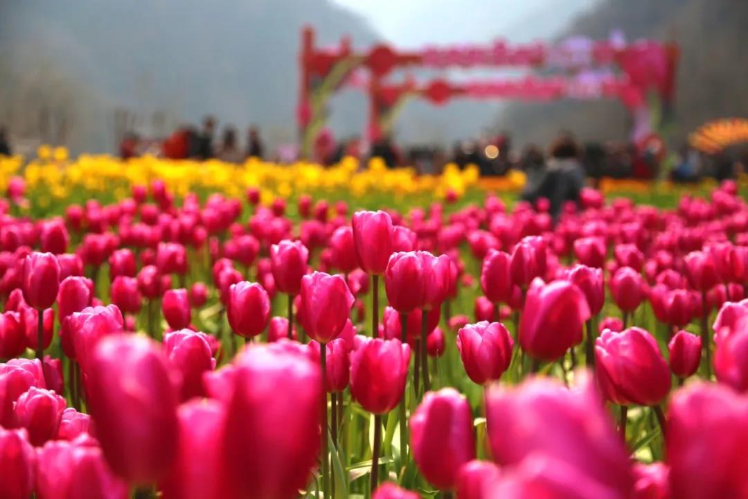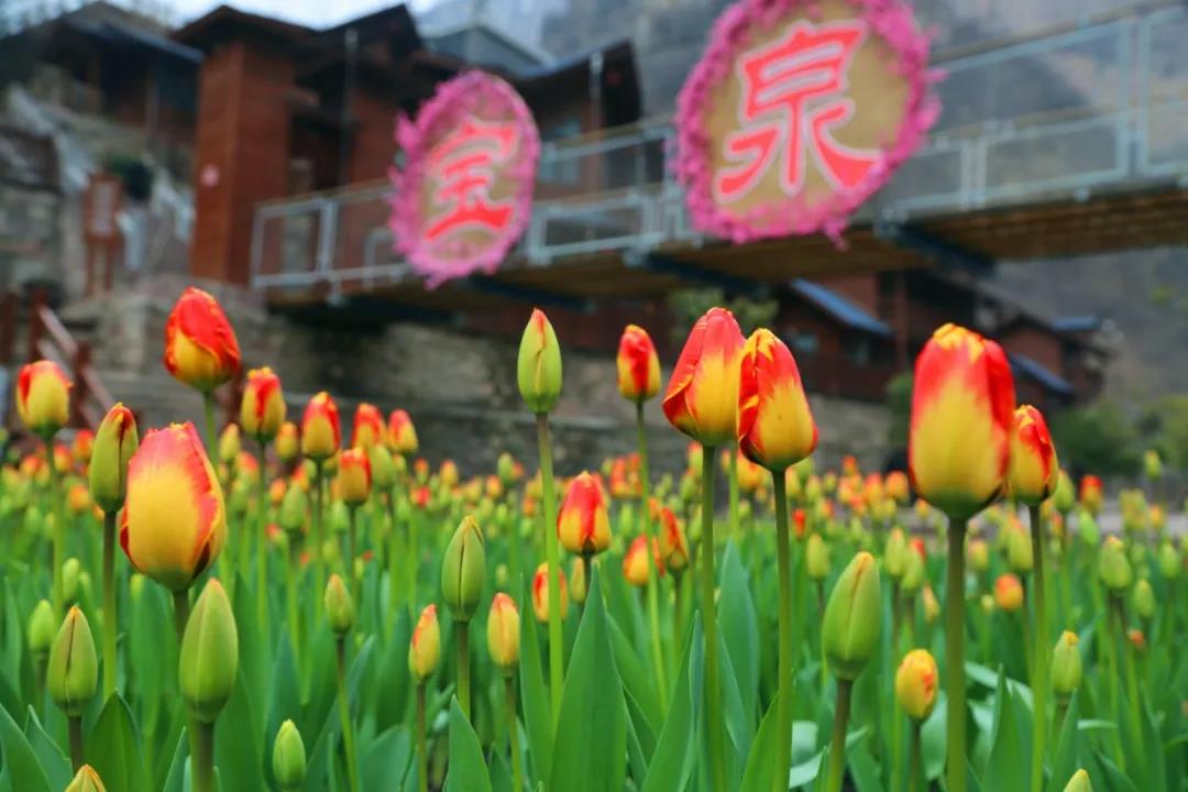 郁金香花海蔓延成片盛開,桃花粉蕾點染枝頭,柳樹新葉抽芽吐綠,煙紅露綠曉風香,一派太行春意盎然的景色。