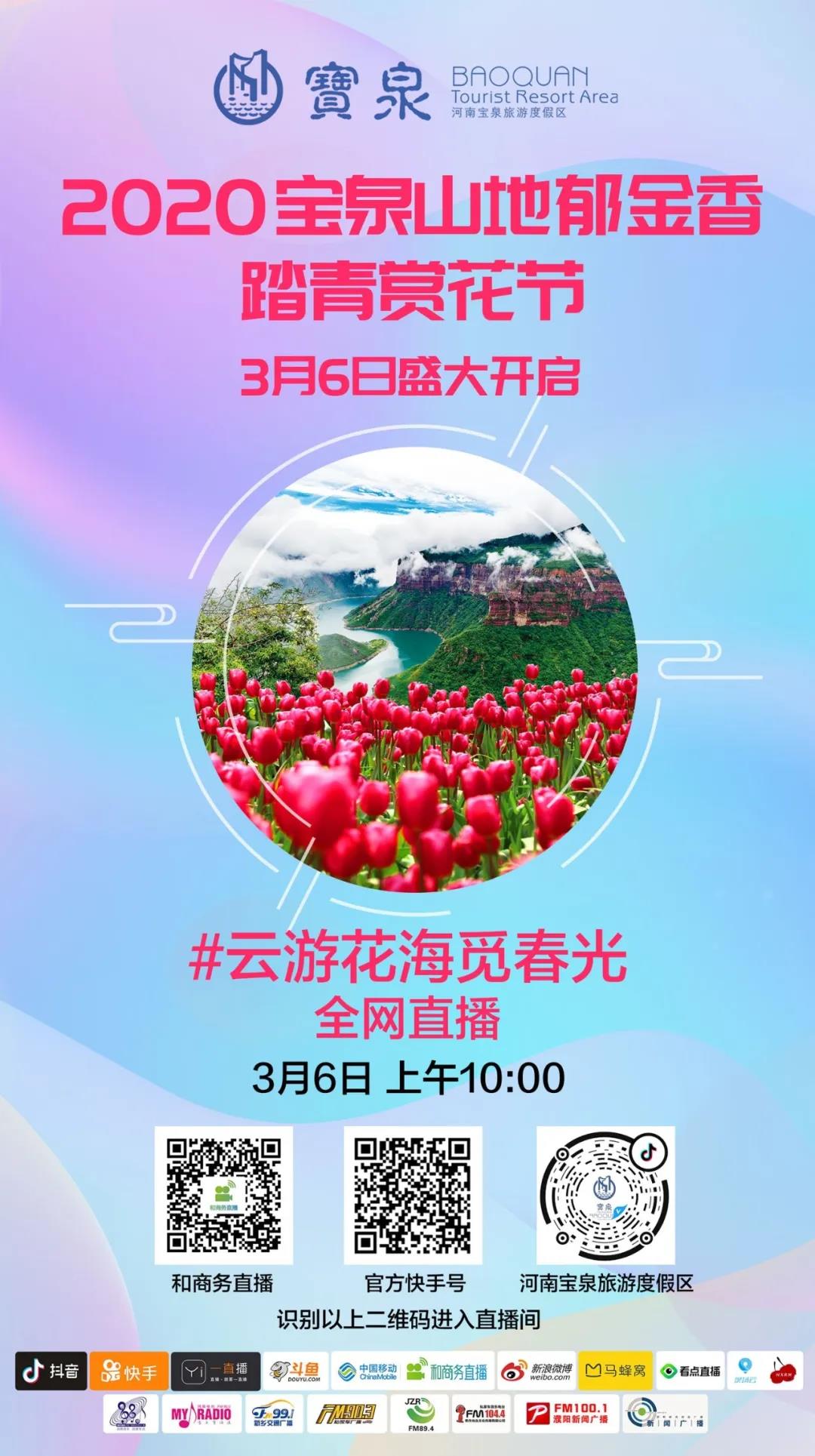 通過中國移動和商務直播平臺和寶泉景區(qū)官方平臺(抖音直播ID:bqjq666、快手直播ID:1319652390、新浪微博ID:317080278)對寶泉郁金香花海、太行碧水丹山進行現(xiàn)場直播。