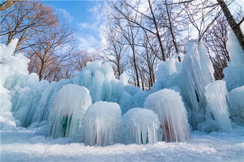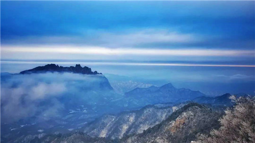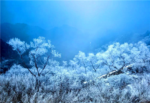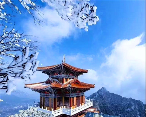 蜿蜒的山路盤旋至玉皇頂,雪洗碧空,一片湛藍。舉頭紅日近,回首白云遠。一回頭,你面前就是瓊樓玉宇的白色世界。