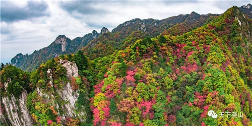 走進(jìn)紅楓谷,乘著古樸的索道,行進(jìn)在秋意玲瓏的山水間。兩側(cè)絕壁紅楓似火,峰頂青松疊翠,谷底清流急湍,風(fēng)景瑰麗如畫;登上玉皇頂,千山萬壑色彩斑斕,千枝萬枝連綿天邊,形成秋景瑰艷、霜色斑斕的人間仙境;攀上青龍背,紅葉繞山轉(zhuǎn),青松高巖立。株株蒼翠與簇簇的紅葉融合在一起,匯成一幅幅渾然天成的圖畫。