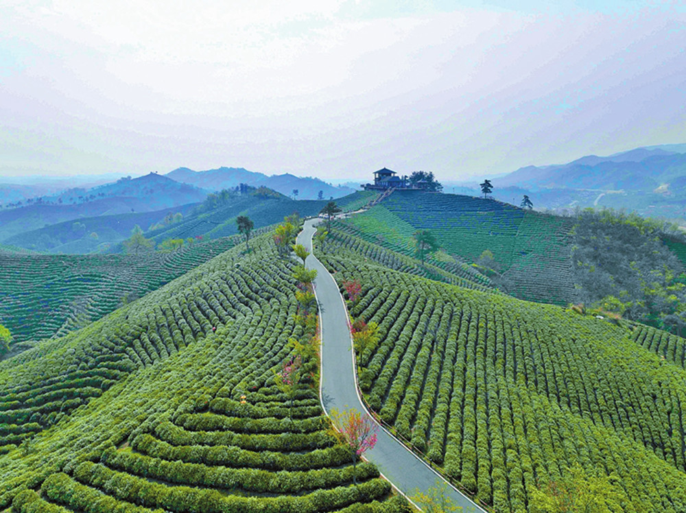 4月,在河南信陽,春風(fēng)吹拂,新綠萌發(fā),萬畝茶海綠意涌動。游客登上信陽文新茶村文新樓,萬畝茶園的秀美風(fēng)景盡收眼底,聽風(fēng)、觀景、品茶、游憩,風(fēng)光醉人。一軒、一亭、一屋、一廊的建筑空間轉(zhuǎn)換,讓人真正體味到“居有竹、賞有花、玩有水、游有廊、住有屋、停有軒、睡有石”的獨(dú)特茶文化魅力,茶園棧道可讓游客置身于茶海中感受濃濃春意。