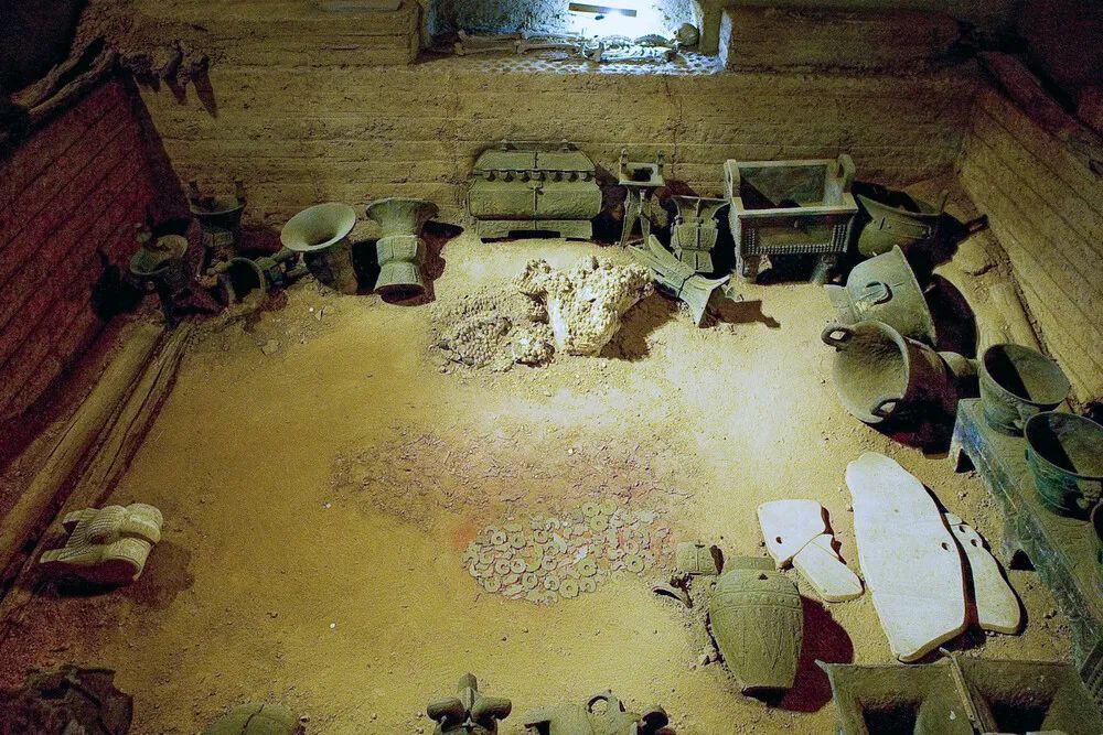 該墓南北長5.6米,東西寬4米,深7.5米。墓上建有被甲骨卜辭稱為“母辛宗”的享堂。墓室有殉人16人,并出土了1928件精美的隨葬品,其中青銅器468件,玉器755件,骨器564件;并出土海貝6800枚。隨葬品不僅數(shù)量巨大,種類豐富,而且造型新穎,工藝精湛,堪稱國之瑰寶,充分反映了商代高度發(fā)達的手工業(yè)制造水平。根據(jù)該墓的地層關(guān)系及大部分青銅器上的“婦好”銘文,考古學(xué)者認定墓主人為商王武丁的配偶——婦好。婦好墓是目前唯一能與甲骨文聯(lián)系并斷定年代、墓主人及其身份的商王室成員墓葬。