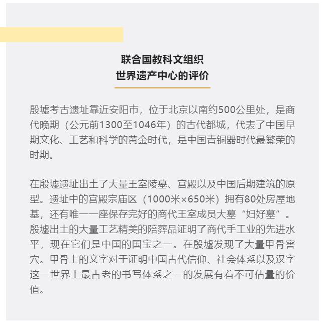 1961年3月,殷墟被公布為第一批國家重點文物保護單位。2001年3月,殷墟被評為“中國20世紀(jì)100項考古大發(fā)現(xiàn)”之首。2006年7月13日,殷墟在第30屆世界遺產(chǎn)委員會會議上被列入《世界遺產(chǎn)名錄》。