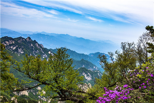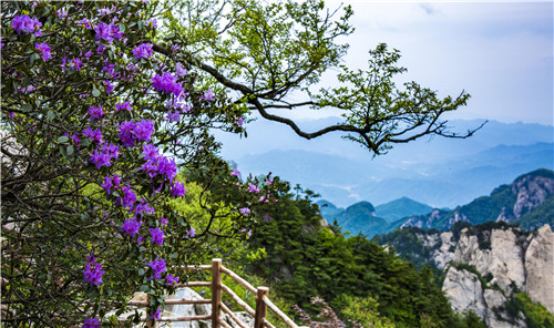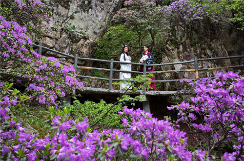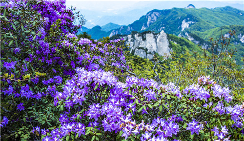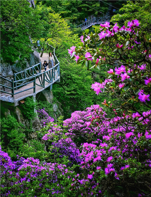 堯山杜鵑有百萬株之多。海拔1600米以下為落葉杜鵑,花色多為紅色,有大紅、粉紅、紫紅等色彩;海拔1600米以上便是高山秀雅杜鵑,花呈紫色,莊重素雅,冷艷脫俗。每年的五月前后,高山秀雅杜鵑進(jìn)入盛開期,山上山下紫霞隨風(fēng)漫天舞,染云峰林相輝映。