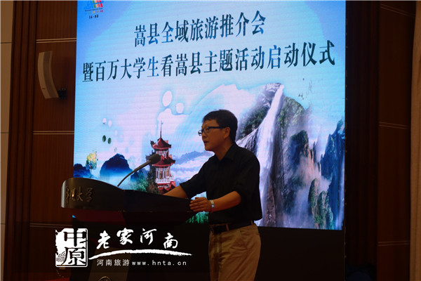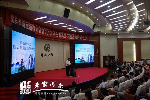 讀萬卷書,行萬里路。6月30日下午,“嵩縣全域旅游推介會暨百萬大學生看嵩縣主題活動啟動儀式”在鄭州大學新校區(qū)舉行。河南省旅游局原巡視員周保建、鄭州大學副校長關(guān)紹康、省旅游局促進處書記周學海、嵩縣政協(xié)主席朱金斗、副縣長毛安福等領(lǐng)導以及我省部分高校院系領(lǐng)導和師生代表、30余家中央駐豫媒體、我省主流媒體代表、嵩縣旅游精準扶貧幫扶活動部分愛心人士代表、嵩縣部分旅游景區(qū)代表和我省部分旅行社代表等出席此次活動,會議由嵩縣縣委常委、副縣長王九位主持。