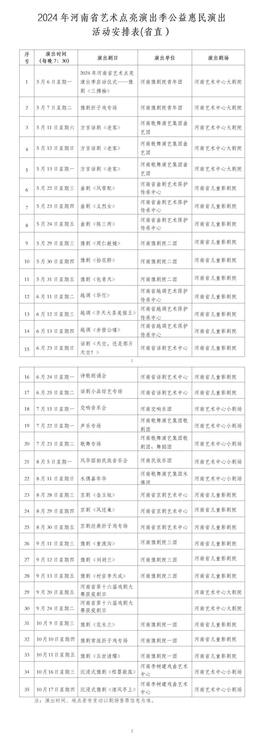 本次活動持續(xù)時(shí)間長、涵蓋范圍廣、藝術(shù)水準(zhǔn)高,將于5月至10月的6個(gè)月里,在全省范圍組織46家文藝院團(tuán),聯(lián)動全省中原文化大舞臺演出,持續(xù)開展200余場精彩劇目和高水平的演藝節(jié)目。演出精選經(jīng)典劇目、新創(chuàng)劇目、折子戲?qū)、音樂會、詩歌朗誦會、歌舞專場、聲樂專場、木偶專場、沉浸式演出等不同藝術(shù)形式,涵蓋豫劇、曲劇、越調(diào)、京劇、話劇等多個(gè)劇種,為全省人民奉上精彩的文化大餐。