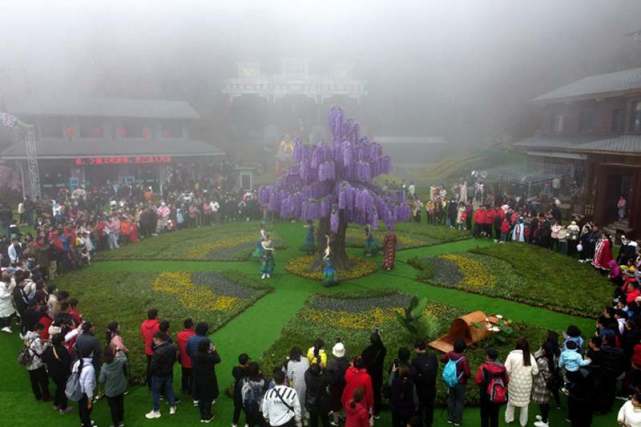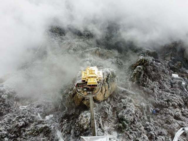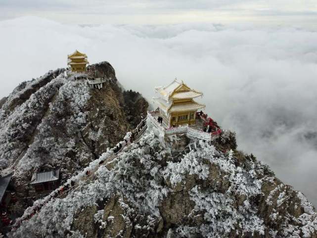 河南洛陽老君山是伏牛山主峰所在地,海拔2000余米,山頂海拔高氣溫低,山上山下溫差大,呈現(xiàn)著兩種不同的景觀, 山上清明時節(jié)雪紛紛,雪花飛舞,玉樹瓊枝與山頂古色古香的建筑群交相輝映,美如仙境。
