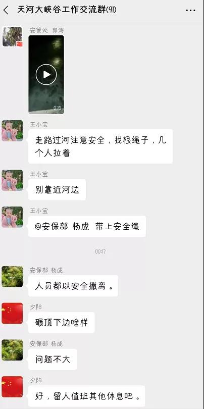 8月1日晚8時,一場暴雨突然來襲,9時過后,接上級部門通知。天河大峽谷景區(qū)迅速啟動汛期應(yīng)急方案,除汛期值班人員外,立即組成應(yīng)急小組,迅速到達景區(qū)內(nèi)各水位監(jiān)測點,對整條游線進行排查,確保將安全隱患降到最低。