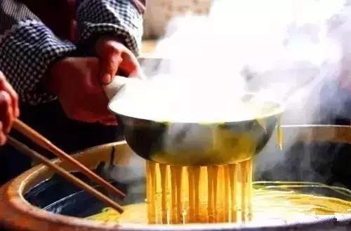 趁熱倒進一特制的漏斗盆里,鍋里或盆里提前防好清水。此時必須是二人操作,一人端盆,一人用勺子使勁擠壓漏盆,順漏斗擠壓出來,就變成了一個個小蝌蚪、小魚魚。然后再把這些魚魚撈在碗里澆上提前配置好的漿水湯,味道十分鮮美,且清涼可口,夏天吃之,十分舒服,冬天也可熱吃。