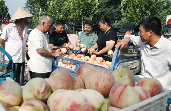“俺種的14畝大桃今年果樹長勢好,畝產(chǎn)在3500斤左右,今個來園里采摘的游客估計有50多人,采摘價格每公斤6元到12元之間。”果農(nóng)郭學(xué)禮和家人一邊忙給客戶稱桃子一邊笑呵呵地說。
