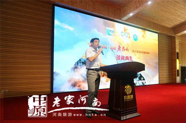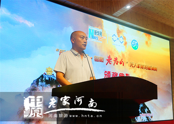 儀式上,新華網(wǎng)河南頻道總監(jiān)梁鵬先生介紹“新華網(wǎng) 鳥瞰老君山無人機航拍大賽”情況。