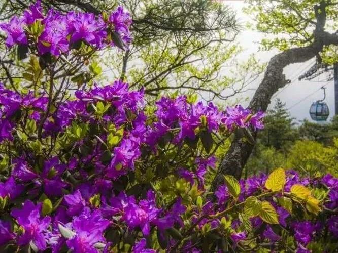 所有山花中,杜鵑花最為秀麗。從黑龍?zhí)毒包c往下到山門一帶,是紅色花朵的杜鵑花,大紅、中紅、粉紅色的花,在景區(qū)公路兩側的山坡上即可看到。堯山珍奇林間花卉植物景觀,分布在海拔1700米以上,花色為藍紫色,花期從5月下旬至6月中旬,盛花期間,漫山遍野,杜鵑成簇連片,宛若紫霧蒸騰,十分瑰麗壯觀。