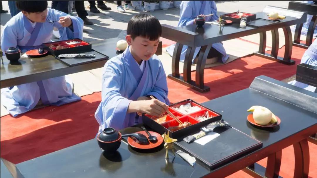 入席的各位賓客還要在司禮的高聲唱領(lǐng)下,統(tǒng)一進行正衣冠、進饌、整理餐具、誦讀《謝食詞》等環(huán)節(jié),之后再一起欣賞獻樂和同飲進食酒。進行完以上步驟,司禮再次高聲響徹廣場:“請”!各位賓客進食開始,同時司禮開始更詳細地講解古人進食的禮儀,包含宴會正在進行過程中的一進酒,二進酒,三進酒等。至此漢宴圓滿禮成。
