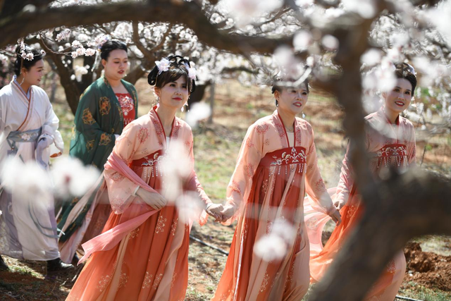 身著古裝的“杏花仙子”們漫步于杏花林中 張春光 攝