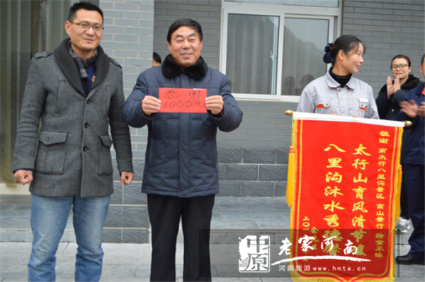 11月8日下午,浙江省金華市余先生委托專人,千里送錦旗褒獎(jiǎng)新鄉(xiāng)南太行八里溝景區(qū)員工張秀麗,錦旗上寫(xiě)“敬謝南太行八里溝景區(qū)高山景行,拾金不昧,太行山育風(fēng)清節(jié)峻 ,八里溝沐水秀德馨。”