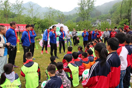 5月6日,“山娃足球”公益活動在欒川縣陶灣鎮(zhèn)協(xié)心村舉行,欒川縣副縣長鄒明武、欒川縣旅游工作委員會主任孫欣欣等領(lǐng)導(dǎo)出席活動儀式,并與山娃足球指導(dǎo)王隨生、鄭州日報文體部主任,鄭州市足協(xié)副主席王微晶,原河南建業(yè)足球隊隊長宋琦、原河南省女子足球隊隊長王瑛等公益人共同參與捐贈活動。陶灣鎮(zhèn)協(xié)心村開啟“體育+旅游+扶貧”新模式。