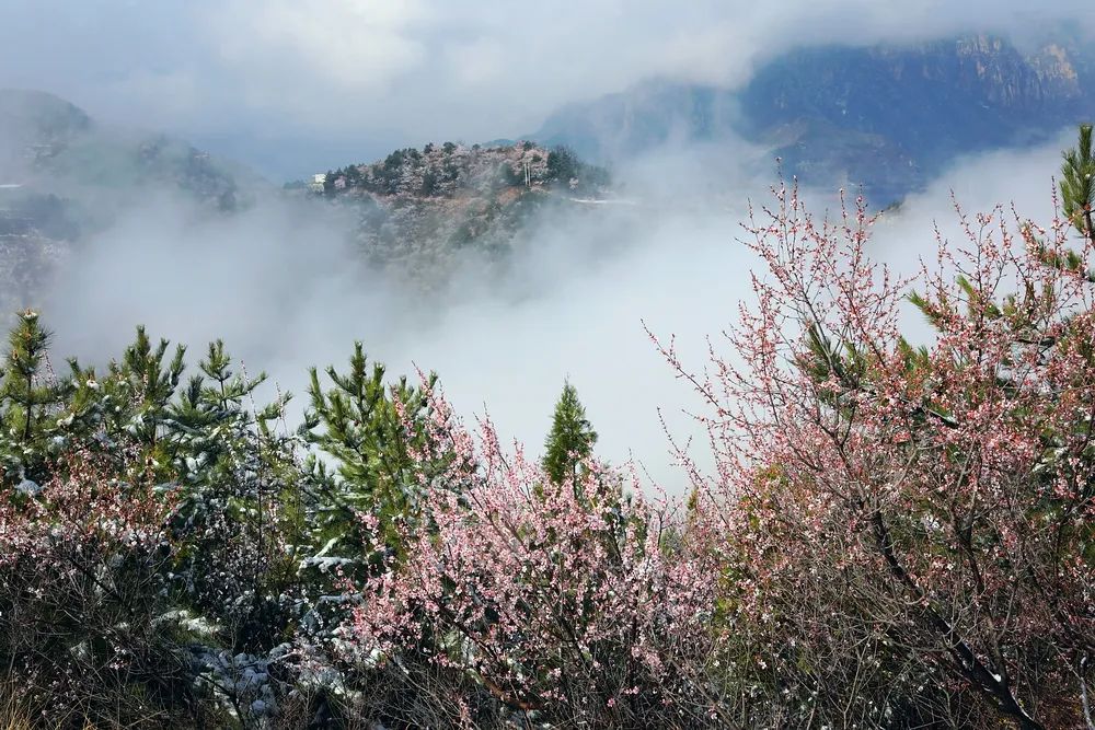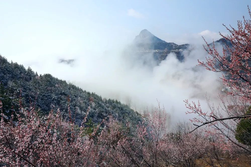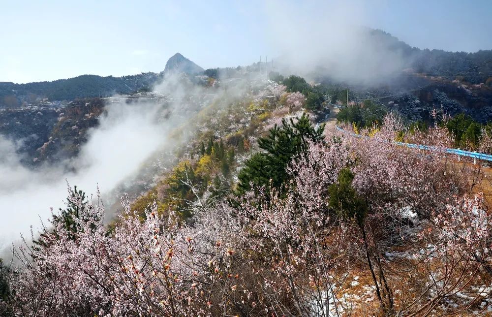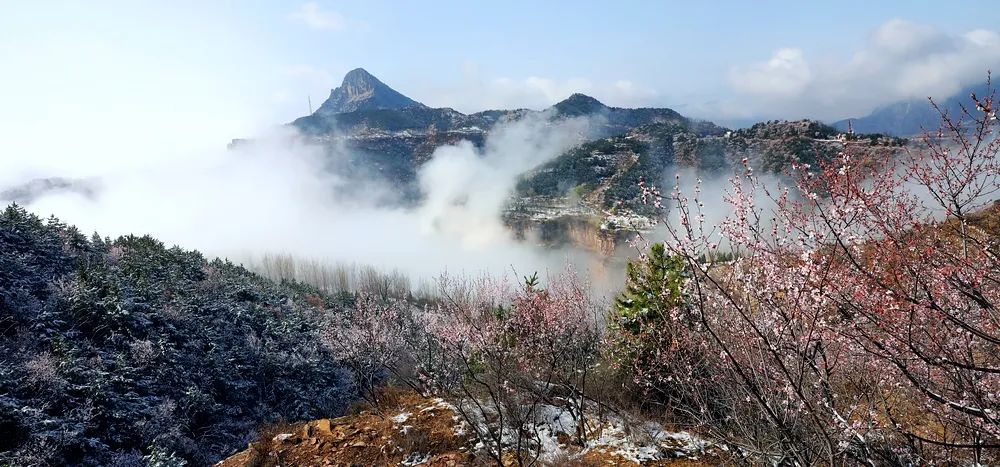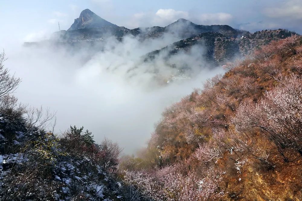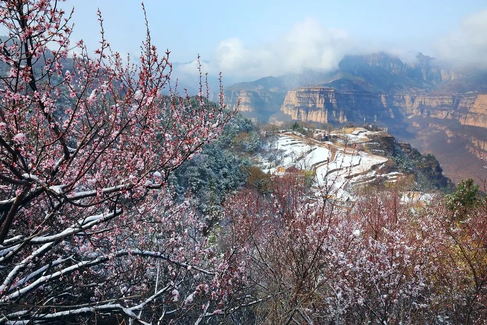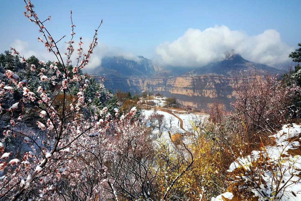 漫步在巍峨秀麗的太行山上,置身在群山峻嶺中,環(huán)顧山間、懸崖邊,處處是春,處處是景,半山春色半山寒,在紅與白的水墨世界里,絢爛多姿。當(dāng)怒放的山花遇上了三月飄雪,花芬芳,雪潔白,讓人如癡如醉,流連忘返。