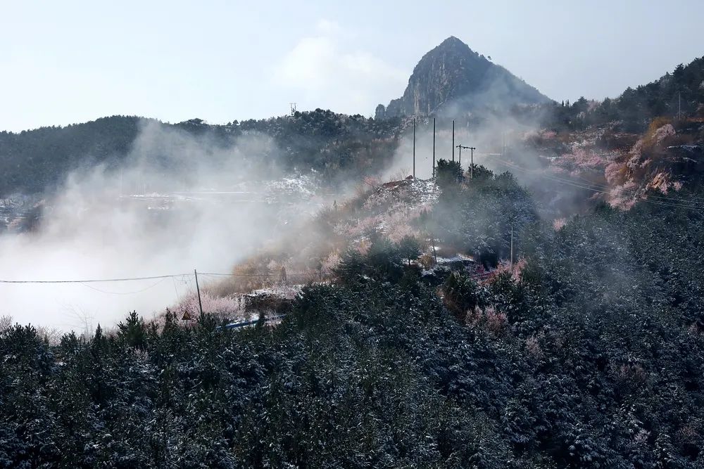 綠樹紅花,云霧白雪,山巒間云霧繚繞,宛若步入仙境一般,美不勝收。