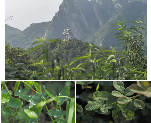 沿著山路側(cè)首回望,山腰處一座小亭獨(dú)立,周邊青綠小草映著晨露