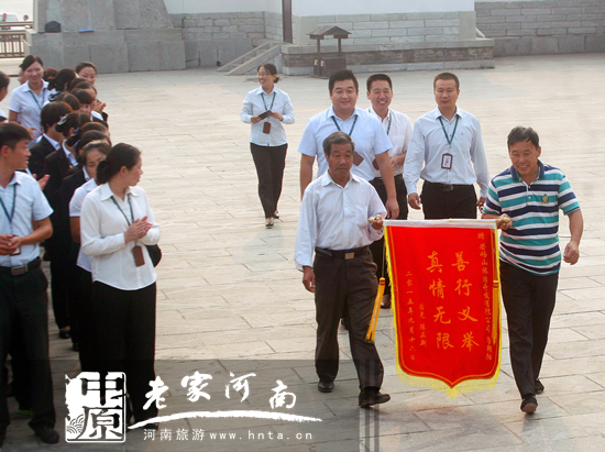 2015年9月19日早晨,芒碭山旅游區(qū)正在召開晨會(huì),一陣鞭炮聲引起了大家的注意,原來(lái)是當(dāng)?shù)厝罕娊o旅游區(qū)一位員工送來(lái)錦旗:贈(zèng)芒碭山旅游開發(fā)有限公司魯朝陽(yáng)“善行義舉 真情無(wú)限”后堯(村)陳正新。