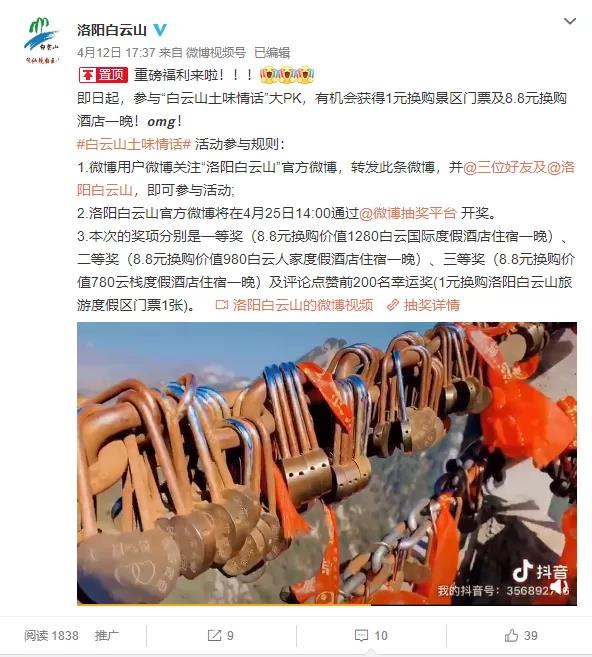 2. 洛陽白云山官方微博將在4月25日14:00抽取一、二、三等獎(jiǎng)及200名幸運(yùn)獎(jiǎng)。