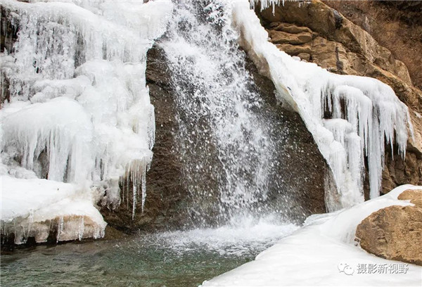 數(shù)九寒冬,河流冰封,河南省盧氏縣老灌河的跌水崖上結(jié)出很多冰瀑。