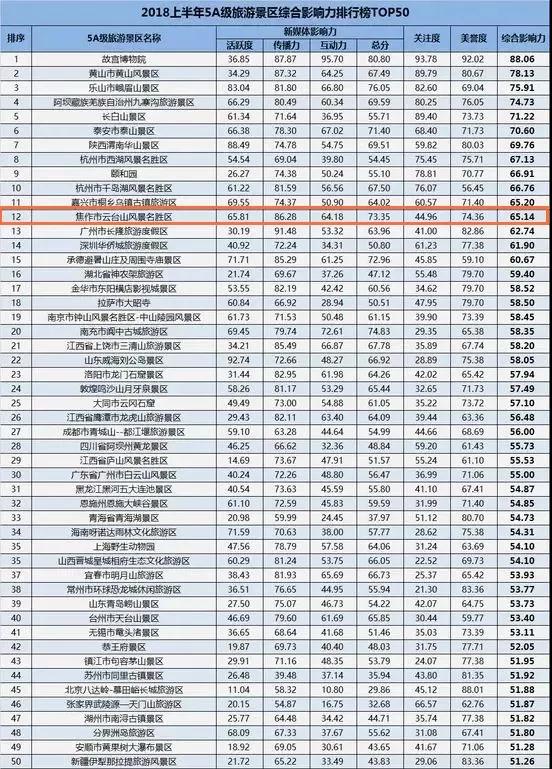 人民網(wǎng)輿情數(shù)據(jù)中心發(fā)布的“2018上半年全國5A級旅游景區(qū)綜合影響力排行榜TOP50”近日出爐,云臺山景區(qū)榮登50強(qiáng)榜單,位列第十二。