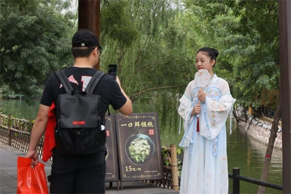 古城商家緊跟熱潮,推出了一系列與漢服相關的文創(chuàng)產(chǎn)品和體驗項目,如漢服租賃、妝造服務、古風攝影等,滿足游客們對古風美學的追求與向往。古城開封以獨有的方式,講述著關于漢服、關于文化的美麗故事,讓傳統(tǒng)與現(xiàn)代和諧共生,綻放出璀璨的光芒。