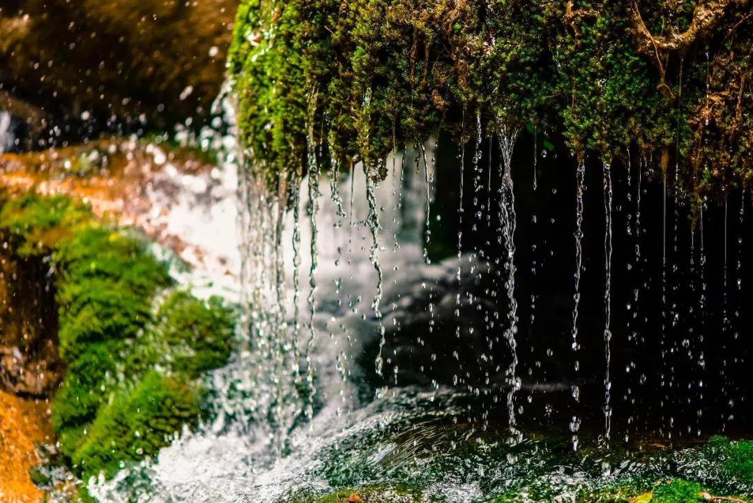 水是大自然的器樂家,彈奏著千遍萬化的聲音,一滴水珠嗒嗒地滴到長(zhǎng)滿青苔的石頭上,腳下溪水潺潺,在石縫間歡快的奔流,瀑布飛花碎玉般地灑滿山澗.