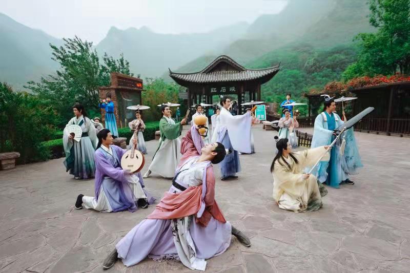 “風(fēng)吹仙袂飄搖舉,猶似霓裳羽衣舞……”在云臺(tái)山丹崖碧水的紅石峽景點(diǎn)內(nèi),麗人行的姑娘仿佛從畫中翩然而來,她們或輕搖團(tuán)扇,或浣花弄茶,或吟歌起舞,與丹崖碧水的峽谷,碧如翡翠的湖水,朦朧裊裊的云霧融為一體,構(gòu)成一幅流動(dòng)的東方古典山水寫意畫,還有詩佛王維、神仙眷侶等人物吸引眾多游客打卡拍照。