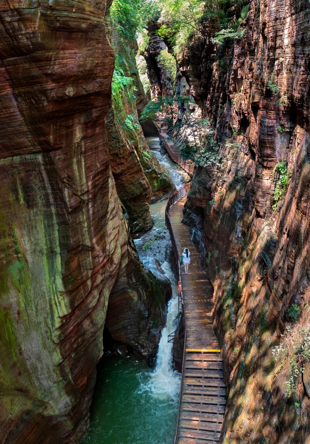 龍?zhí)洞髰{谷景區(qū)是一條由紫紅色石英砂巖經(jīng)流水追蹤下切形成的U型峽谷,全長14公里,核心游覽區(qū)分為龍?zhí)端、高峽甕谷、山崩地裂、龍隱谷、龍山天池等各具特色的景段。