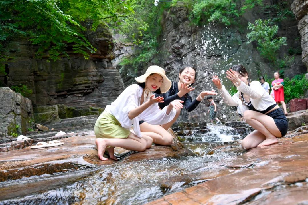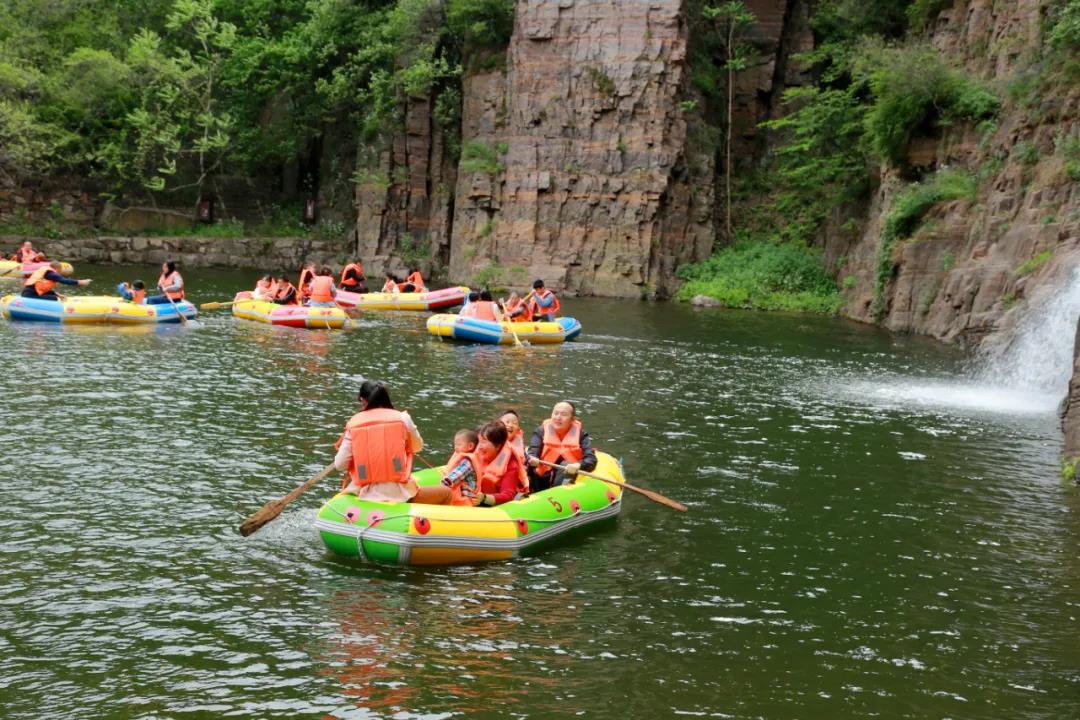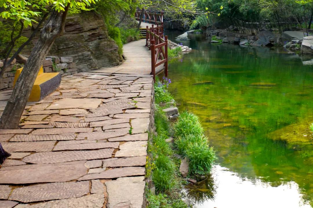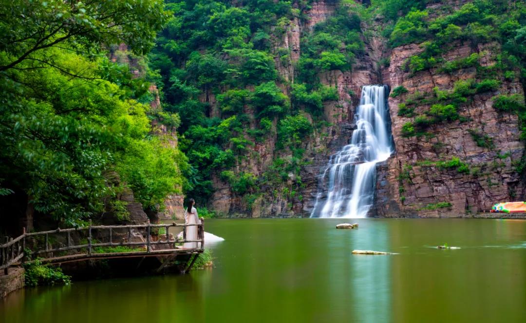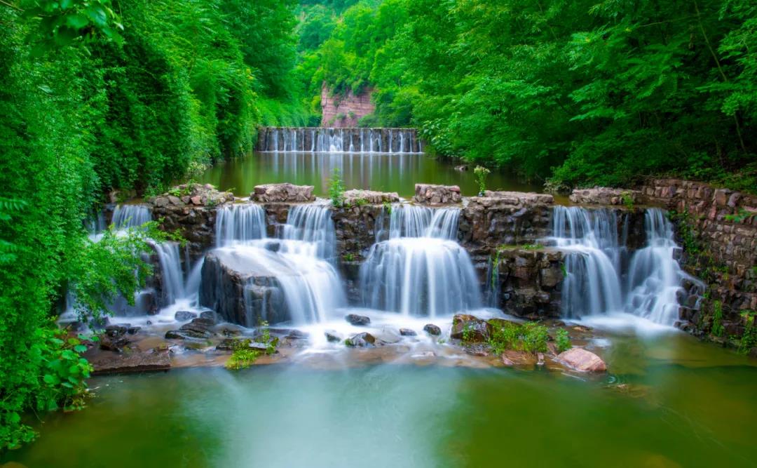 繼續(xù)往前走我們看到的是五龍?zhí),五龍(zhí)堕L約300m,寬約50m,深2-5m。是人工堵截河道而形成的大型水體景觀。潭水四周分布著五條山脈,猶如五條巨龍環(huán)抱著這一泓清水,所以叫五龍?zhí)。沿著五龍(zhí)兜谋卑队斡[。將近距離欣賞山光水色。五龍?zhí)镀俨甲阅习督^壁懸溝口處跌落而下,是五龍?zhí)端脑搭^。平日里,深潭高瀑,參差有韻,紅崖素簾,美麗動人。遇到雨季,咆哮的流水傾瀉而下,轟然作響,猶如虎嘯龍吟,聲震四野。