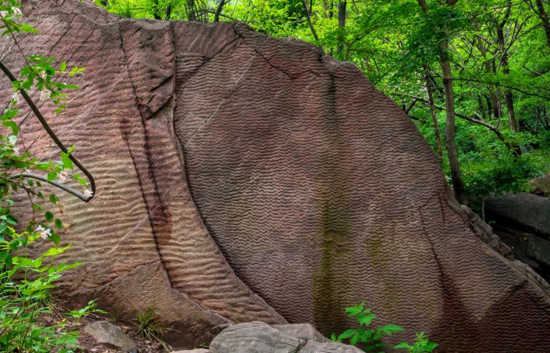 您到過海灘吧?有沒有注意到海灘上的一道道波痕?在龍?zhí)洞髰{谷景區(qū),波痕已固結(jié)成巖,且隨處可見,許多路上鋪的都是波痕石。景區(qū)波痕石的波峰基本對稱,波長較長,波峰、波谷均圓滑,脊線多為直線形,出現(xiàn)分叉,可能是浪成波痕(構(gòu)造波痕是由風(fēng)、水流或波浪等介質(zhì)的運動在沉積物表面所形成的一種波狀起伏的層面構(gòu)造。按成因可分為浪成、流水成因和風(fēng)成波痕三種類型。其中,前兩種為淺水波痕;風(fēng)成波痕多出現(xiàn)于沙漠、湖泊和海濱岸的沙丘沉積中)。
