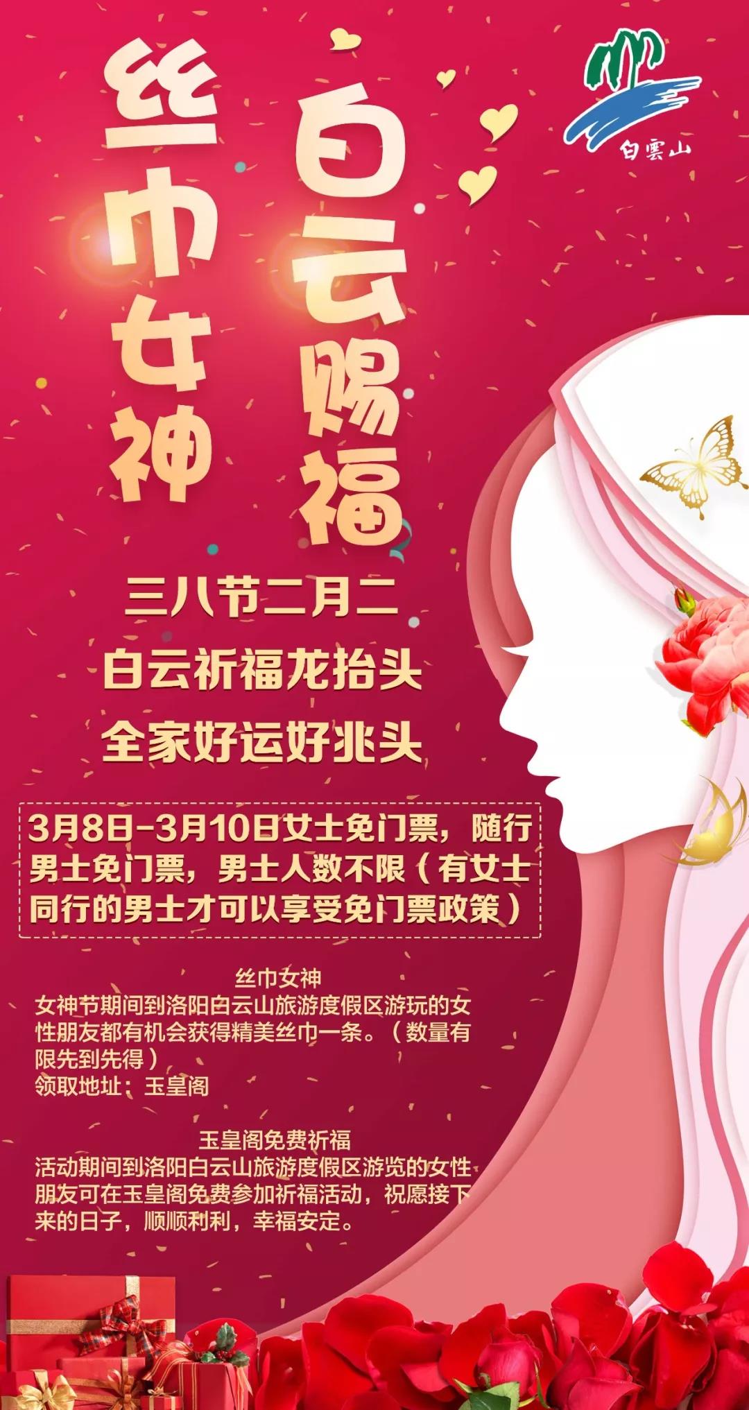為慶祝三八國際勞動婦女節(jié),同時啟動白云山2019年春季旅游市場,白云山旅游度假區(qū)將在3月8日至10日舉辦以“絲巾女神 · 白云賜福”為主題的系列活動。屆時,景區(qū)將針對女士及隨行男士免門票,并對團隊推出了一系列優(yōu)惠政策。女神節(jié)期間,女性朋友到洛陽白云山旅游度假區(qū)游玩將獲得精美絲巾一條并免費參加玉皇閣道長主持的祈福法會活動。