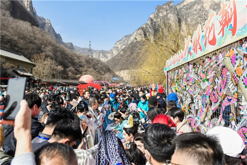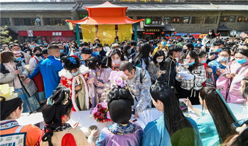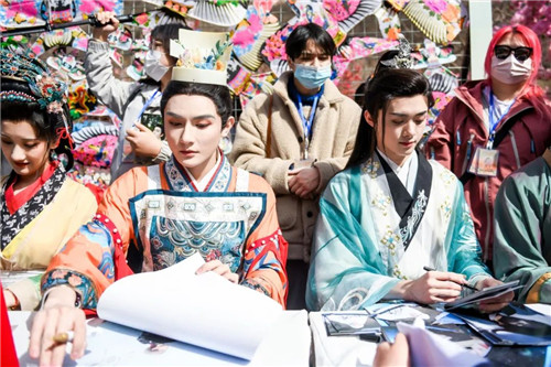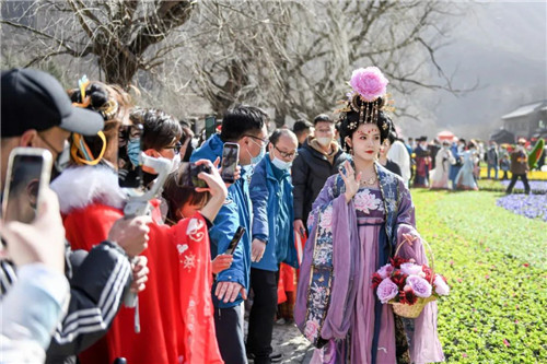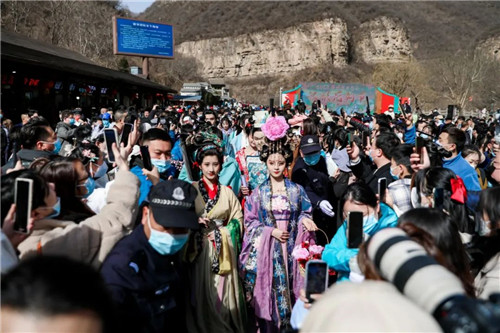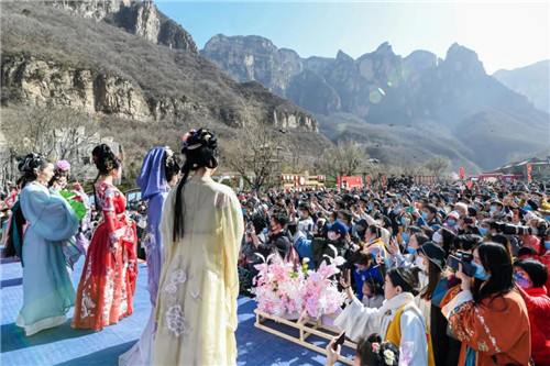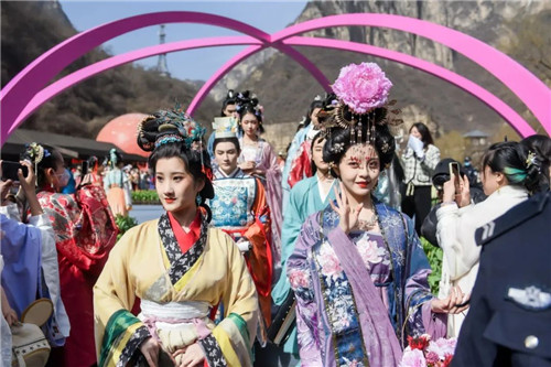 竹林七賢、十二花神齊聚,與數(shù)百名漢服和傳統(tǒng)文化愛好者組成巡游方陣,在山巒疊翠之間徜徉春日花海,與現(xiàn)場同袍游客沉浸互動,重現(xiàn)“花朝盛宴”!央廣網(wǎng)、中國旅游報、河南電視臺都市頻道,大河報、河南旅游資訊網(wǎng)等眾多媒體對本次活動進(jìn)行現(xiàn)場直播和報道,網(wǎng)友在線“云”賞漢服盛會,“云”游春日勝景!