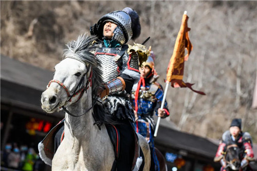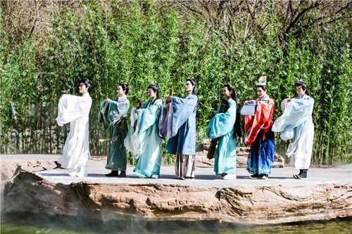 上午10點,旌旗招展、鼓聲震天,身著甲胄的威武勇士馳騁而來震撼開場,持續(xù)30天的云臺山漢服文化盛宴就此啟幕!漢服達(dá)人@盧卓、@宮寒、@陳家葦?shù)然?ldquo;竹林七賢”寄情山水、撫琴嘯歌,再現(xiàn)魏晉名士風(fēng)采;美輪美奐的國風(fēng)舞曲《曲池荷》、大氣磅礴的民樂合奏《象王行》、人舞而偶動的木偶花神非遺展示,形式各異的表演打造漢服文化視覺盛宴。