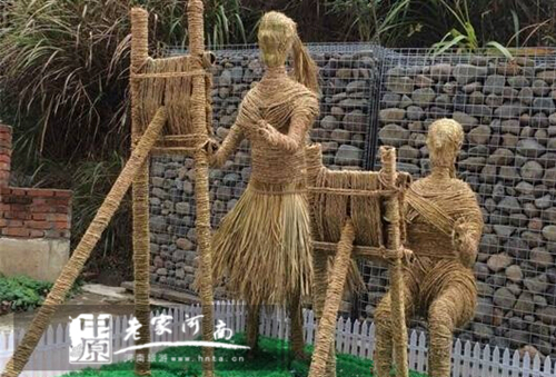 這些稻草人都是西九華山的員工純手工制作,很費工時。要先由電腦設(shè)計出圖案,再用竹子搭起模架,然后再將一根根清理過的稻草進行搓編成繩,編成的繩子按竹模架進行纏繞,再在不同部位用小鐵絲扎緊,做一個簡單的人物,至少也要三五天。
