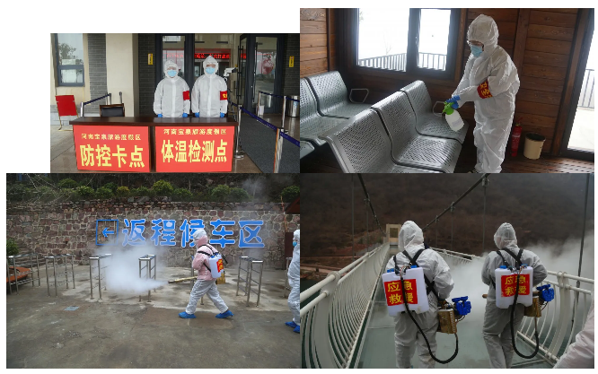 5、專業(yè)隊(duì)伍來支援。開園前期,來自輝縣市應(yīng)急救援協(xié)會(huì)的八名隊(duì)員攜帶專業(yè)消毒工具和近百瓶消毒液、酒精,對(duì)景區(qū)內(nèi)外環(huán)境、辦公場(chǎng)所、室內(nèi)空間等區(qū)域開展消毒工作,為景區(qū)防疫工作提供有力保障。