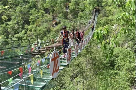 新建項(xiàng)目網(wǎng)紅探險(xiǎn)橋,備受游客青睞。龍?zhí)稖暇W(wǎng)紅探險(xiǎn)橋位于九龍圣母潭上方,橋的入口位于景區(qū)內(nèi)最精華景點(diǎn)——四連瀑布觀景臺(tái)處,探險(xiǎn)橋全長(zhǎng)118米,離地100多米,由玻璃探險(xiǎn)橋和鐵鎖鏈探險(xiǎn)橋兩部分組成。置身于探險(xiǎn)橋上,向前可欣賞到秀美壯觀的四連瀑布,向下可以俯瞰到龍?zhí)稖系奶镀傧噙B,曲徑通幽,可謂美不勝收!