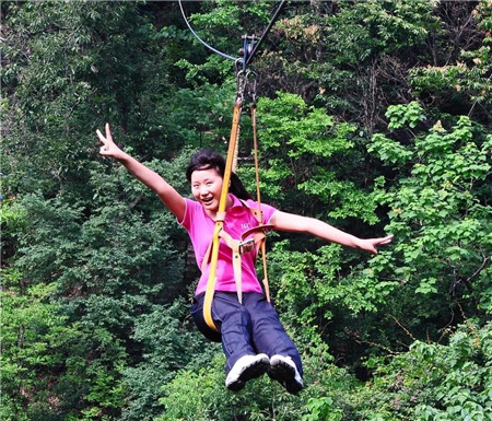 只要系上安全帶,僅在短短幾分鐘之內(nèi),即可腳踏白云,映襯著藍(lán)天,讓步青山、峽谷、瀑布、山巒在身下一晃而過,驚恐中,非常平安地從這個(gè)山頭到達(dá)那個(gè)山頭。凡有過這種體驗(yàn)的游客,都說玩龍?zhí)稖系?ldquo;空中滑索”,就是爽!