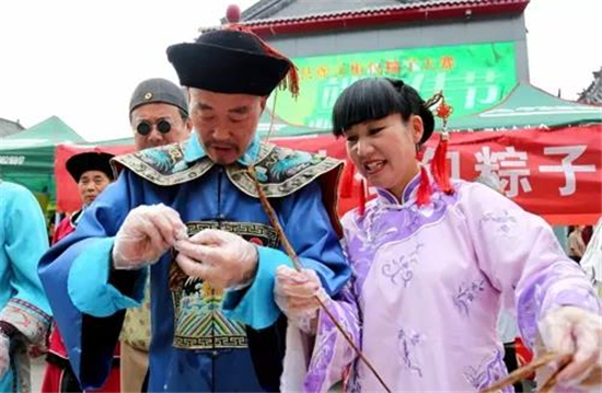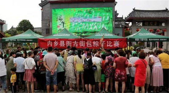 在縣衙古街,一場別開生面的包粽子比賽拉開帷幕。內(nèi)鄉(xiāng)縣衙的“知縣”攜夫人、衙役走出衙門,在縣衙古街玄武廣場與百余名學(xué)生和部分游客比賽包粽子,熱火朝天的比賽場面吸引了眾多游客參與。最終,“知縣”攜夫人給比賽中表現(xiàn)突出的小選手們戴上了五彩線,送去了弄弄的端午祝福。