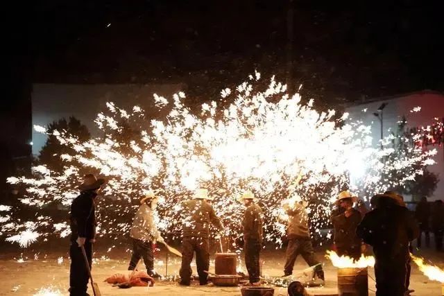 表演者楊金生師傅說,打犁鏵,是一項專業(yè)技能,先要選擇平坦開闊的場地,搭砌冶鐵火爐;然后,把生鐵放入火爐中的器皿中;待碎鐵化成鐵汁后,一個表演者用專用長柄小勺,把鐵汁舀出,拋向空中;然后,另一個表演者手持木掀,用力把拋在空中鐵汁打散,鐵汁在夜空中即變成閃亮的各種各樣圖案。