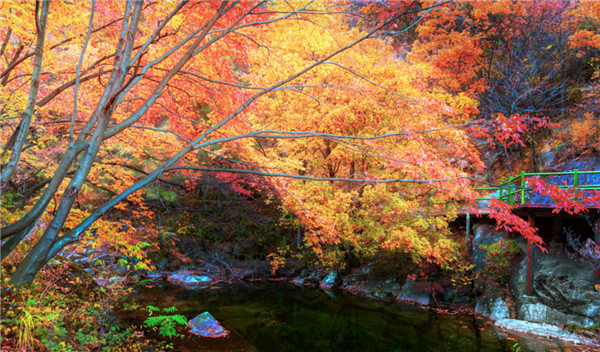 如果你沒有看過紅葉,一定要去天河大峽谷,因?yàn)槟抢锏募t葉迷人;如果你看過紅葉,更要去天河大峽谷,因?yàn)槟抢锏那锷砣。去過欒川的天河大峽谷,才知道霜葉紅于二月花的意境之美……