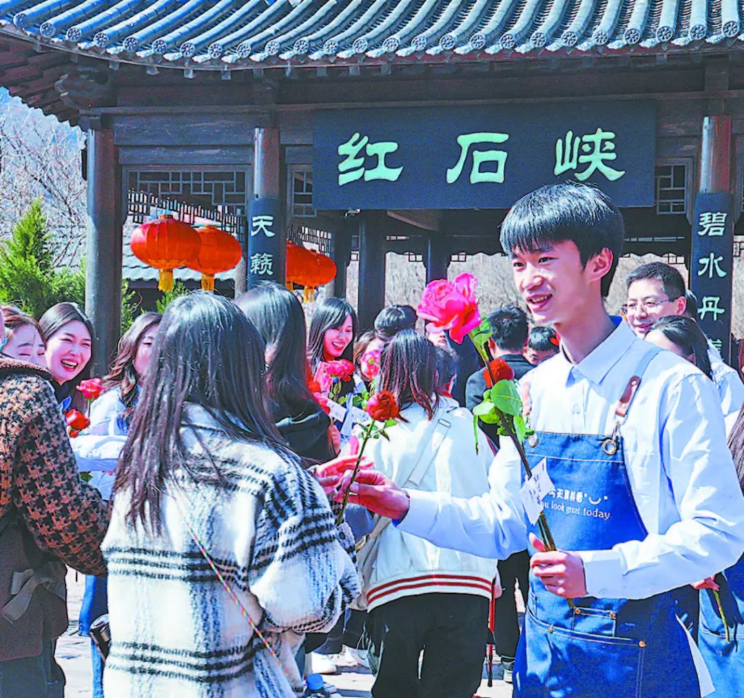 3月8日,云臺(tái)山景區(qū)工作人員免費(fèi)為女性游客發(fā)放玫瑰花,祝她們節(jié)日快樂(lè)。