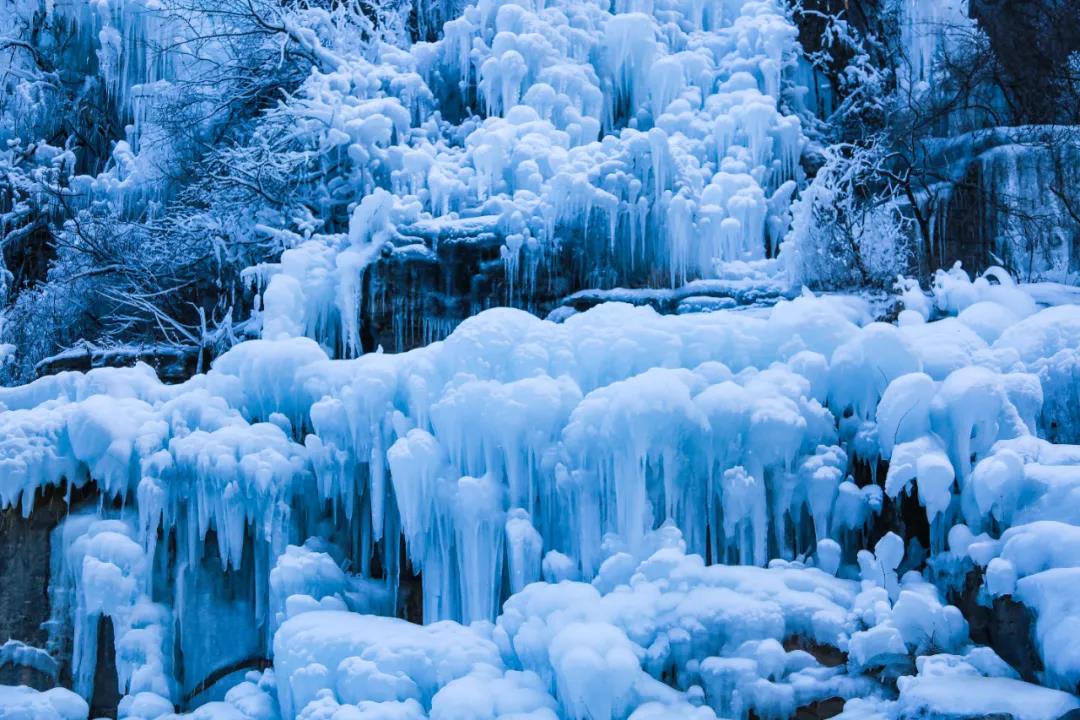 夢幻藍(lán)冰掛滿崖壁,千米峽谷晶瑩剔透,冰瀑、雪簾,千姿百態(tài)依崖而下,置身其中,宛若走進(jìn)了冰晶的璀璨世界