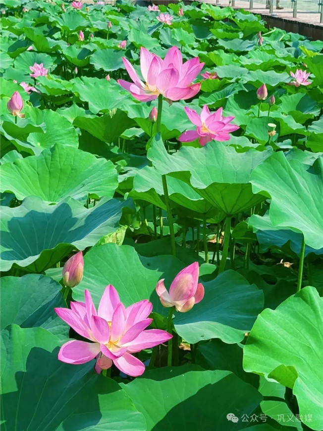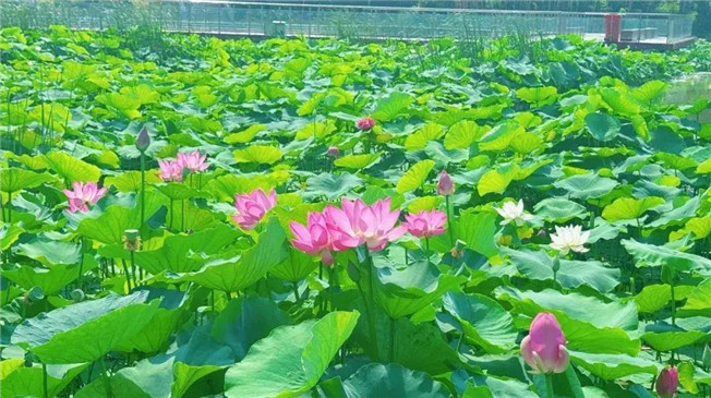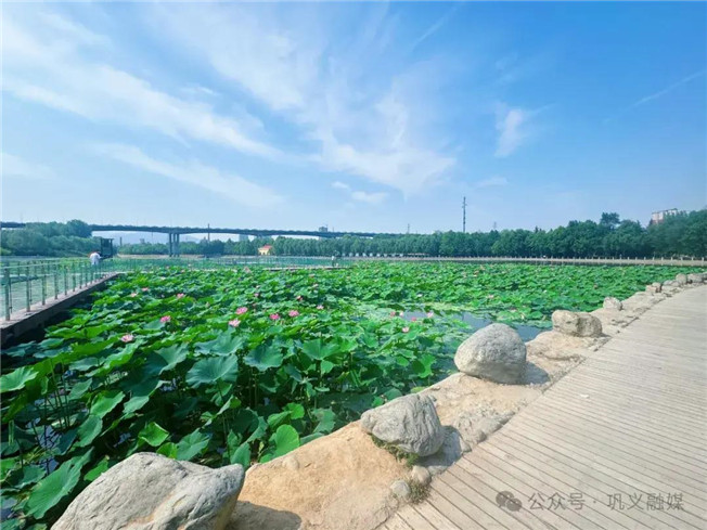 為提升水質(zhì),改善水生態(tài),提高河道景觀。近年來,我市園林綠化中心陸續(xù)在石河道中央公園新興大橋、中原大橋下的淺水區(qū)種植了荷花。如今,這些荷花已陸續(xù)綻放,碧綠的荷葉、絢麗的花朵相互映襯,構(gòu)成了一幅絕美的畫卷,為鞏義的夏日增添了一抹清新與詩(shī)意。