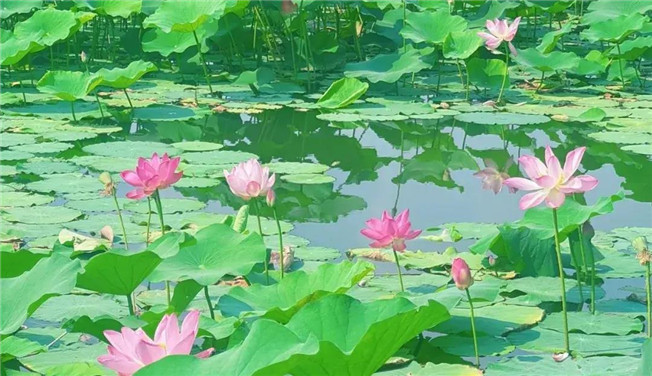 鞏義市園林綠化中心石河道管理二所所長(zhǎng)孫軍峰:“石河道中央公園的荷花集中種植在新興橋下和中原西路橋下的5號(hào)湖、6號(hào)湖淺水區(qū),主要種植有披針紅、白牡丹、粉千葉、粉千層等品種,種植了6萬多株,4萬多平方米,花期在6月到9月。目前荷花已經(jīng)盛放,大家可以來此賞花拍照,但因荷花種植環(huán)境,大家在游玩時(shí),要文明賞花、注意安全。”