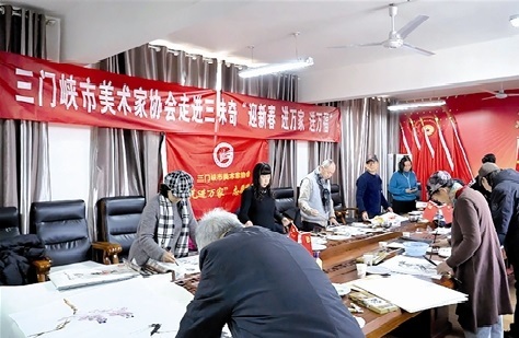 市美術(shù)家協(xié)會(huì)文藝志愿者凝神運(yùn)筆,為河南三味奇食品有限責(zé)任公司廣大職工創(chuàng)作水墨畫(huà),送上新春祝福。 宋杰 攝